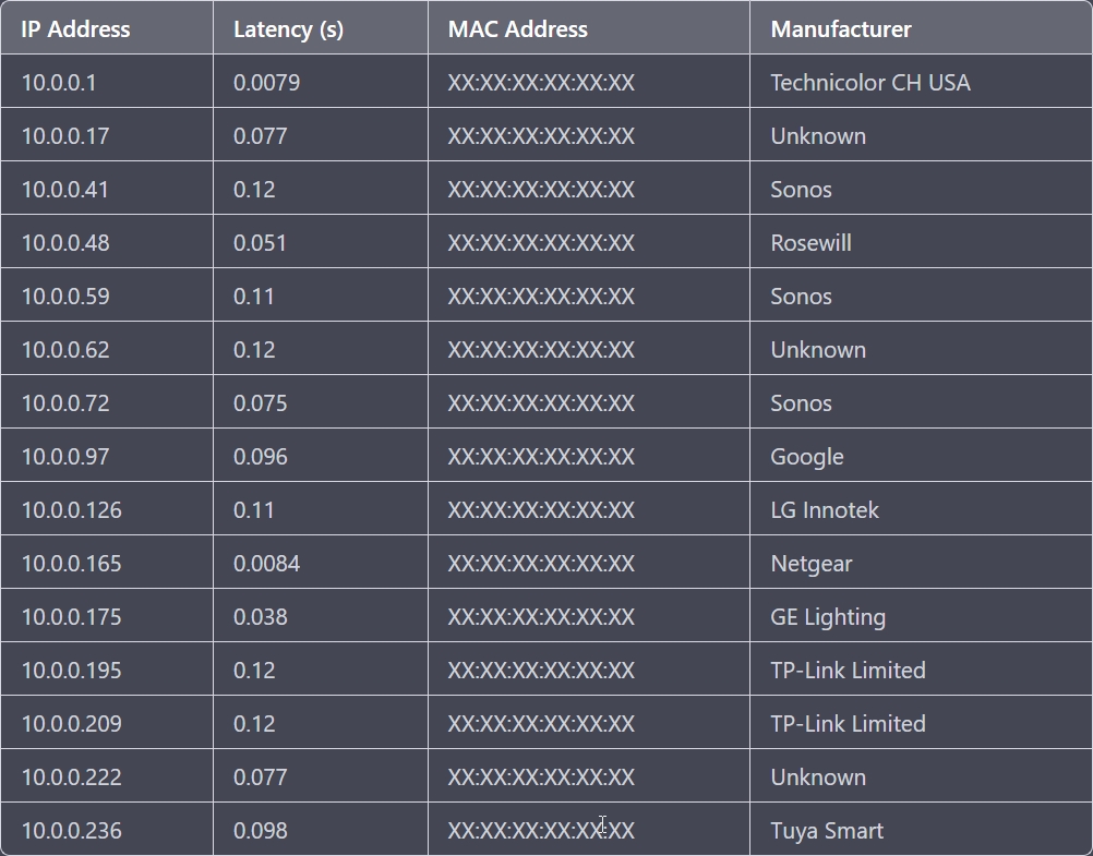A network exploration tool that scans a network for live hosts and provides basic information such as MAC address and manufacturer.