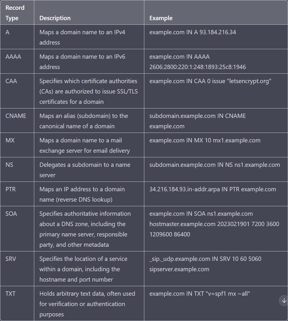How does DNS work? DNS works by maintaing a distributed database of domai names and their corresponding IP Addresses. When a user types in a domain name in their web browser, the browser sends a DNS query to a DNS server, which then looks up the corresponding IP Address and returns it to the browser.