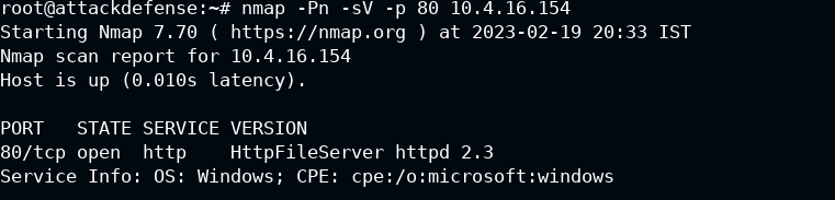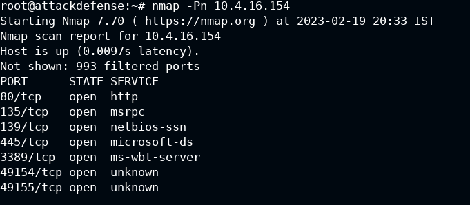 We then ran our first nmap scan against our target 10.4.16.154 which determined that the target was blocking ping probes, which indicated we needed to use -Pn , this switch tells Nmap to do no ping, which skips the host discovery stage altogether.